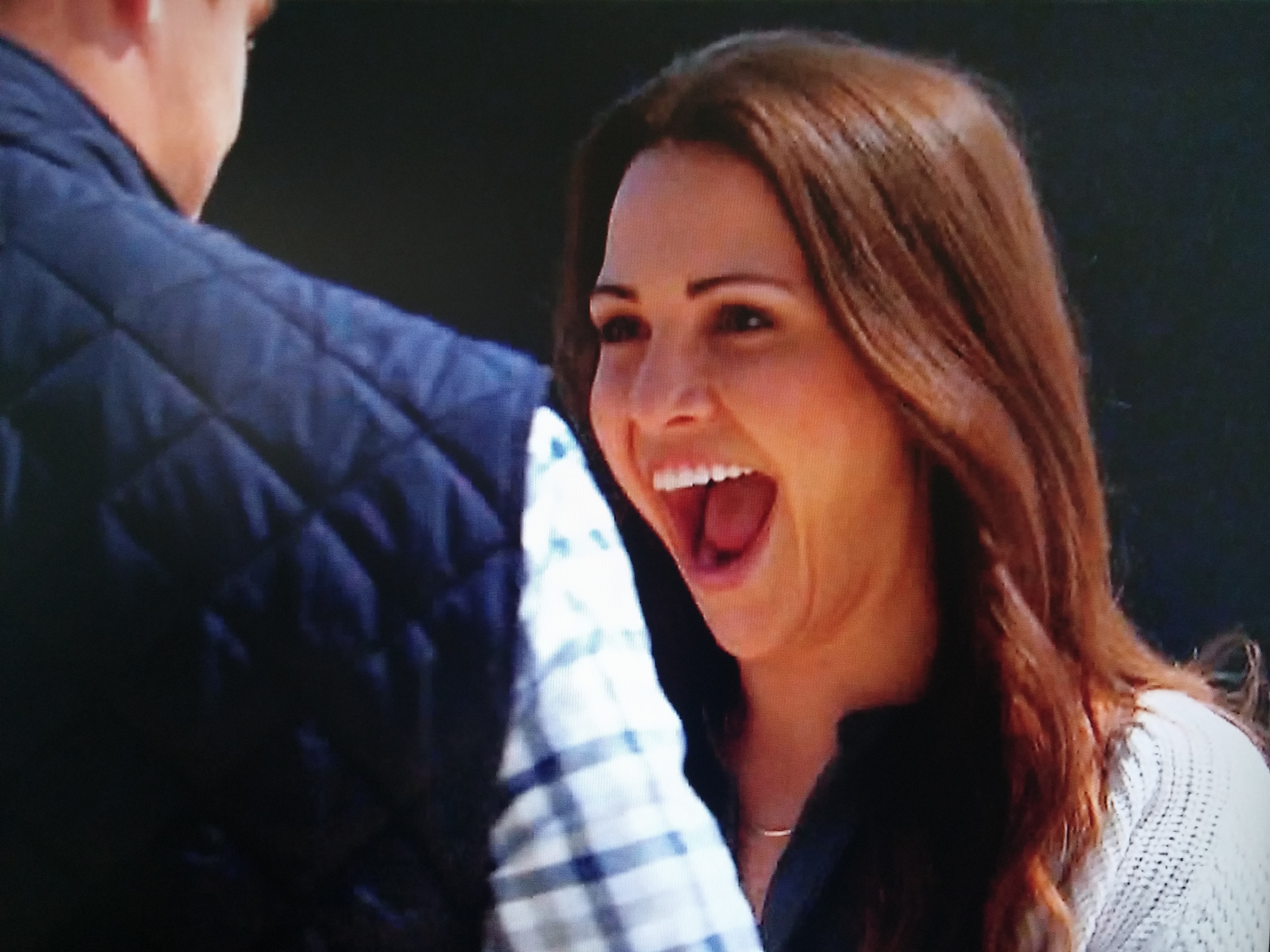 Off to Iowa, where we see Chris walking through his backyard, which is approximately the size of Marin County. Andi meets him at the corner of No and Where, and we get to see her Super-Excited-Open-Mouth face: