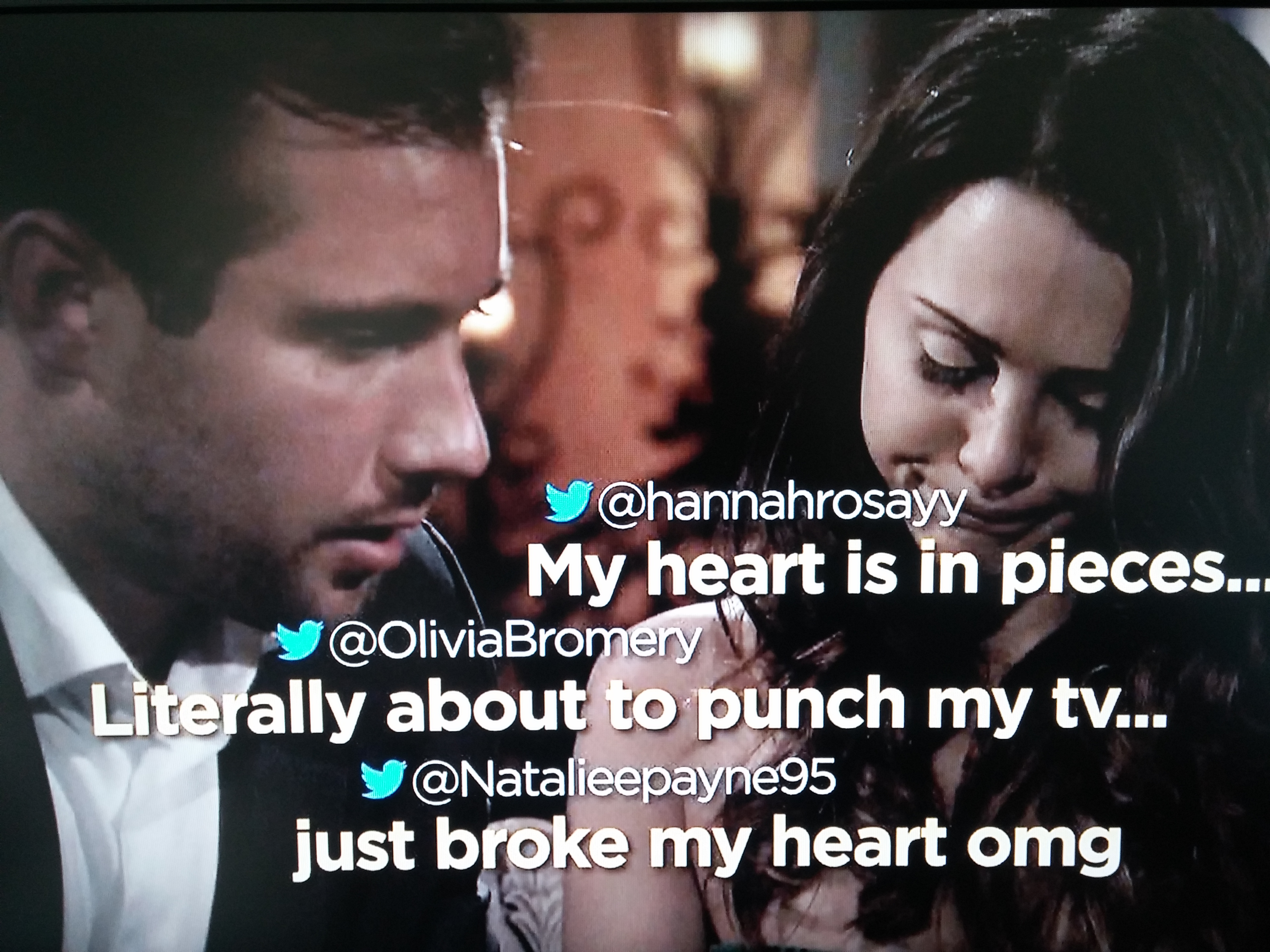 Dinner at Casa de Campo. They talk about what kinds of parents they’ll both be, which I find hilarious. My Lovely Better Half and I had this conversation once. I know now that it’s like trying to predict how you’ll react when you get hit by a bus. You have no idea what it’s actually going to feel like, and when it does happen, you’re not exactly the one in control. But, by all means, have fun raising your pretend children. Josh says he wants a lot of kids. If I was Andi, I’d ask what he means by “a lot”. Are we talking about 2 or 3, or are we talking Nick’s family? He tells Andi he loves her again, and she gives us one of these: