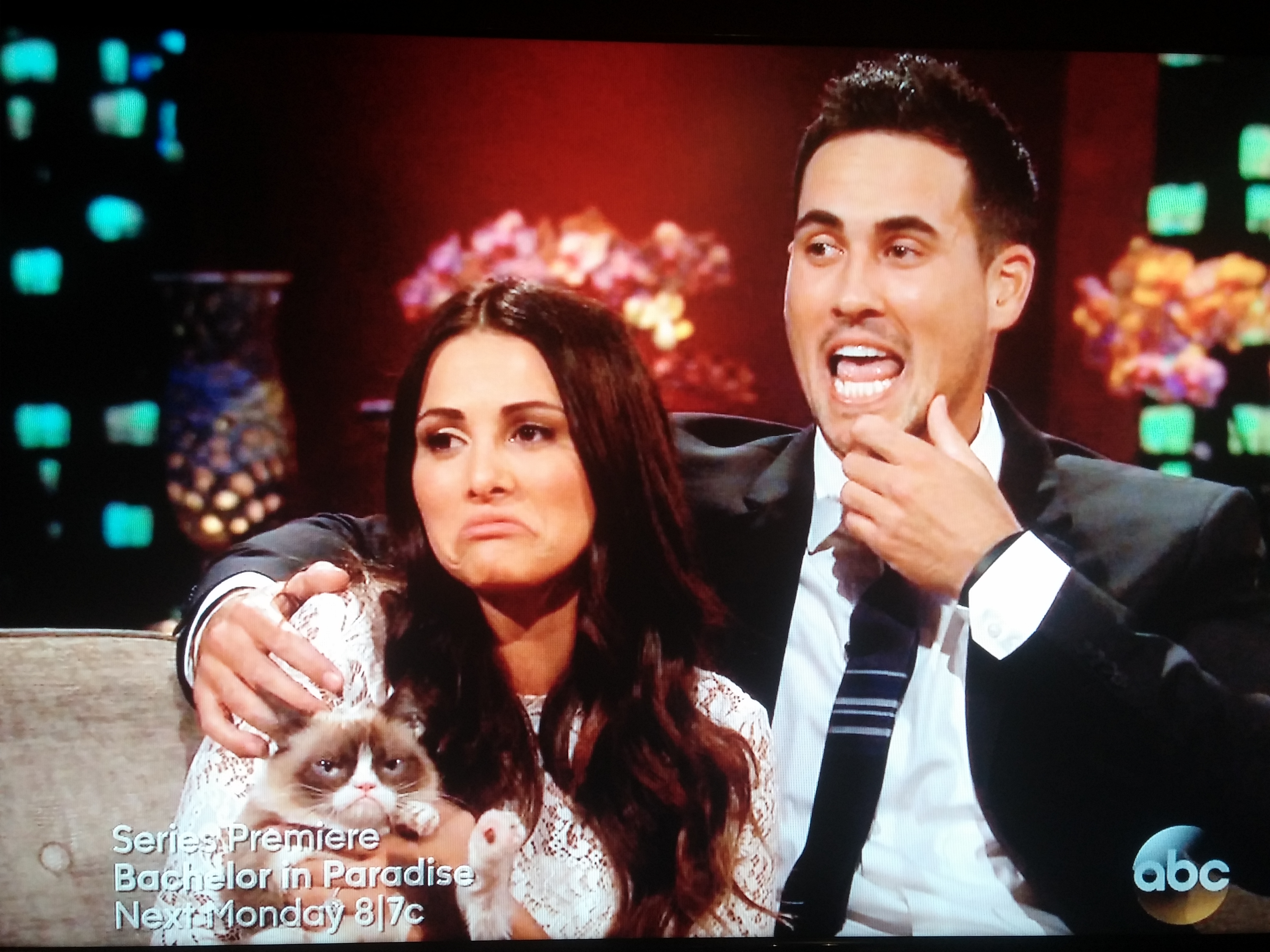 Don’t feel like you need to use the whole couch, guys. If they were any further apart, the camera crew would have to swap in a wide angle lens. They talk for a while, and she eventually says they had a good relationship, but she wasn’t in love with him and her connection with Josh was stronger. I get the vibe that the thing that bothers him the most wasn’t getting dumped, but the reassurance he got from Andi (or thinks he got) that he would eventually be her choice; he feels deceived more than anything. I don’t know if she was giving him signals and changed her mind last minute or if he was reading it wrong the whole time. I do know he looked like a convincing front-runner right up to the moment that Andi knocked on his door in the Dominican Republic. Whatever; the best part of the segment is when Nick plays dirty and asks her why she had sex with him if she didn’t love him. Boom! That’s a lo-fi move, brother. Then he follows it up by describing how special the night was, even calling it a “fiancé type of night”. Josh is gonna love hearing that! How much do you want to be a fly-on-the-wall for that car ride home? Andi defends herself pretty well but Nick doesn’t let it go. Mercifully, Chris Harrison cuts it off before it gets too weird. Next up, we’ll see Andi and Josh together for the first time as an engaged couple! But first, yet another Bachelor in Paradise promo while the crew tries to get Josh to stop punching holes in the green room wall!
