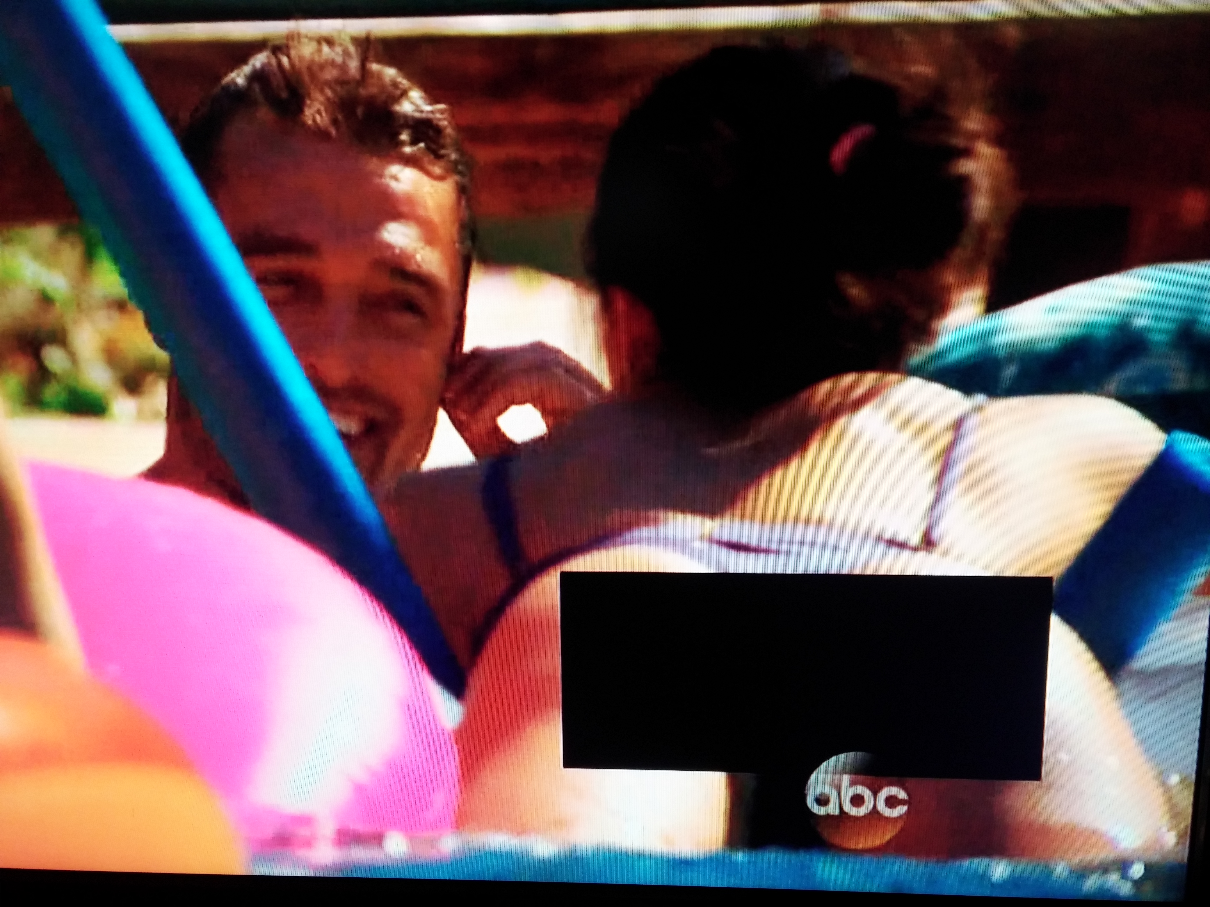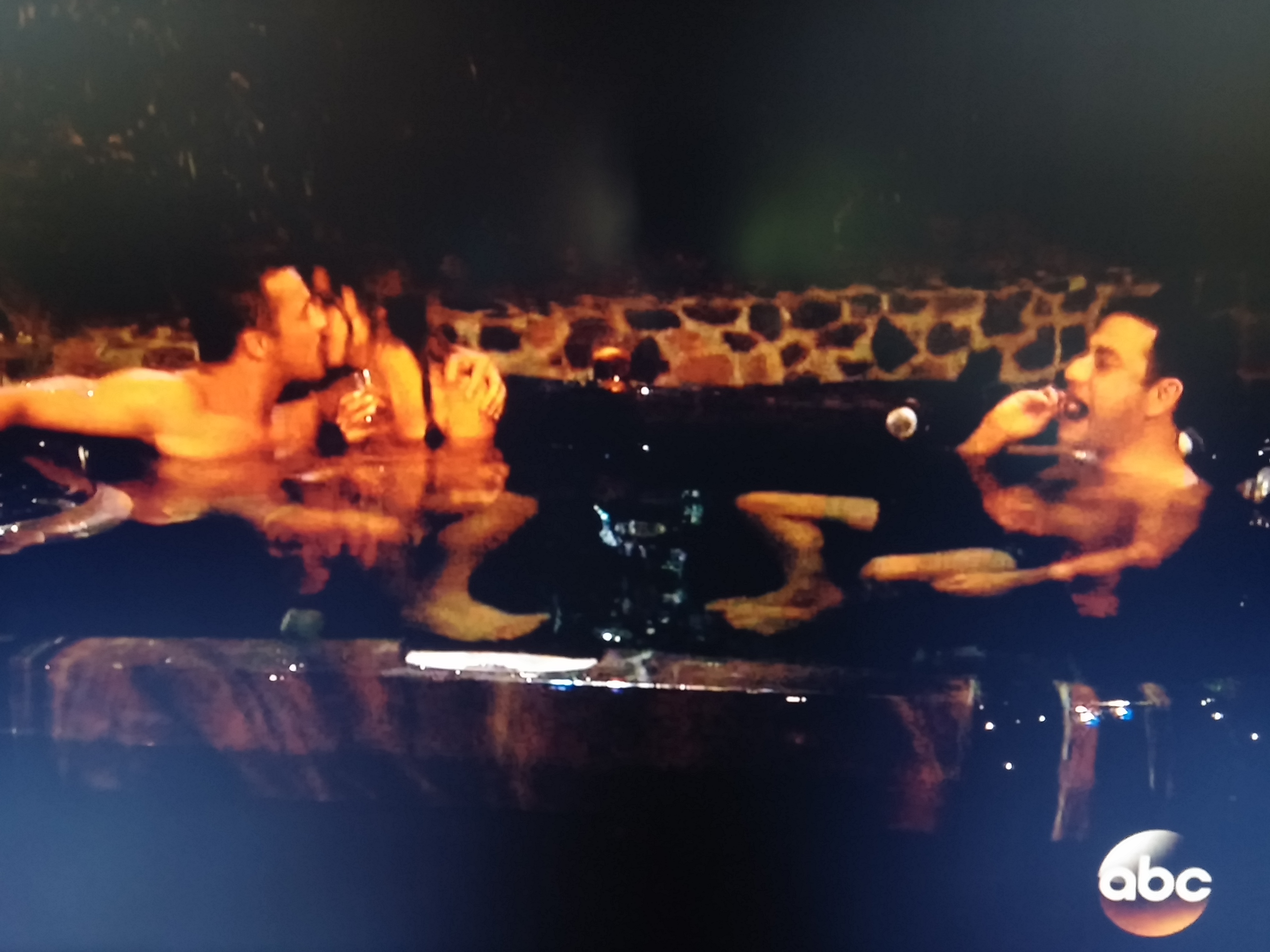 I hope Kaitlyn really does get her own island someday, because the rules on Pirate Island sound amazing (drink). Chris makes a speech, gives her a rose (because what guy wouldn’t after that answer), and then they exchange more awkward, close-mouthed pecks in the hot tub while Kimmel eats chicken.