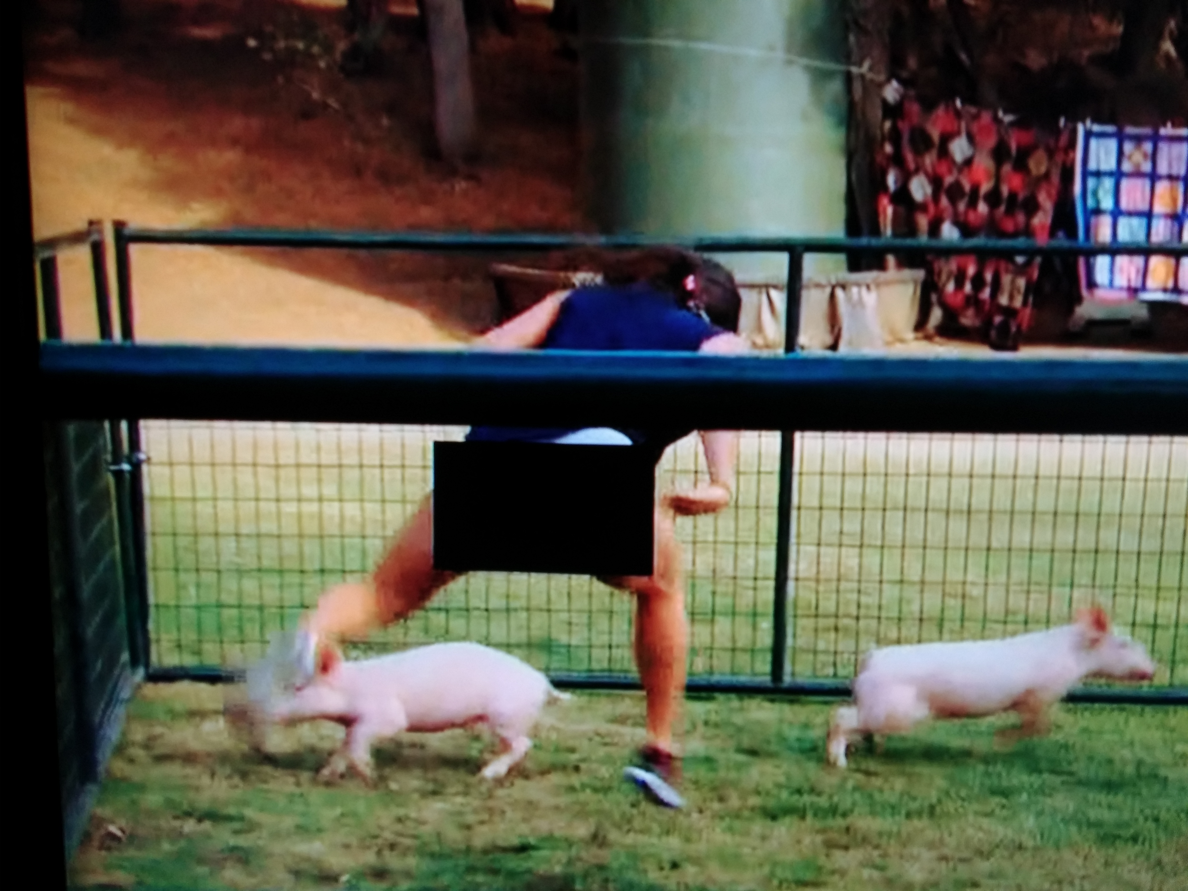 Everyone meets in a field for the Hoe down-Throw down – basically a Ninja Warrior course for farmers, complete with corn-shucking, goat milking, pig chasing, and shit-shoveling. Notables: