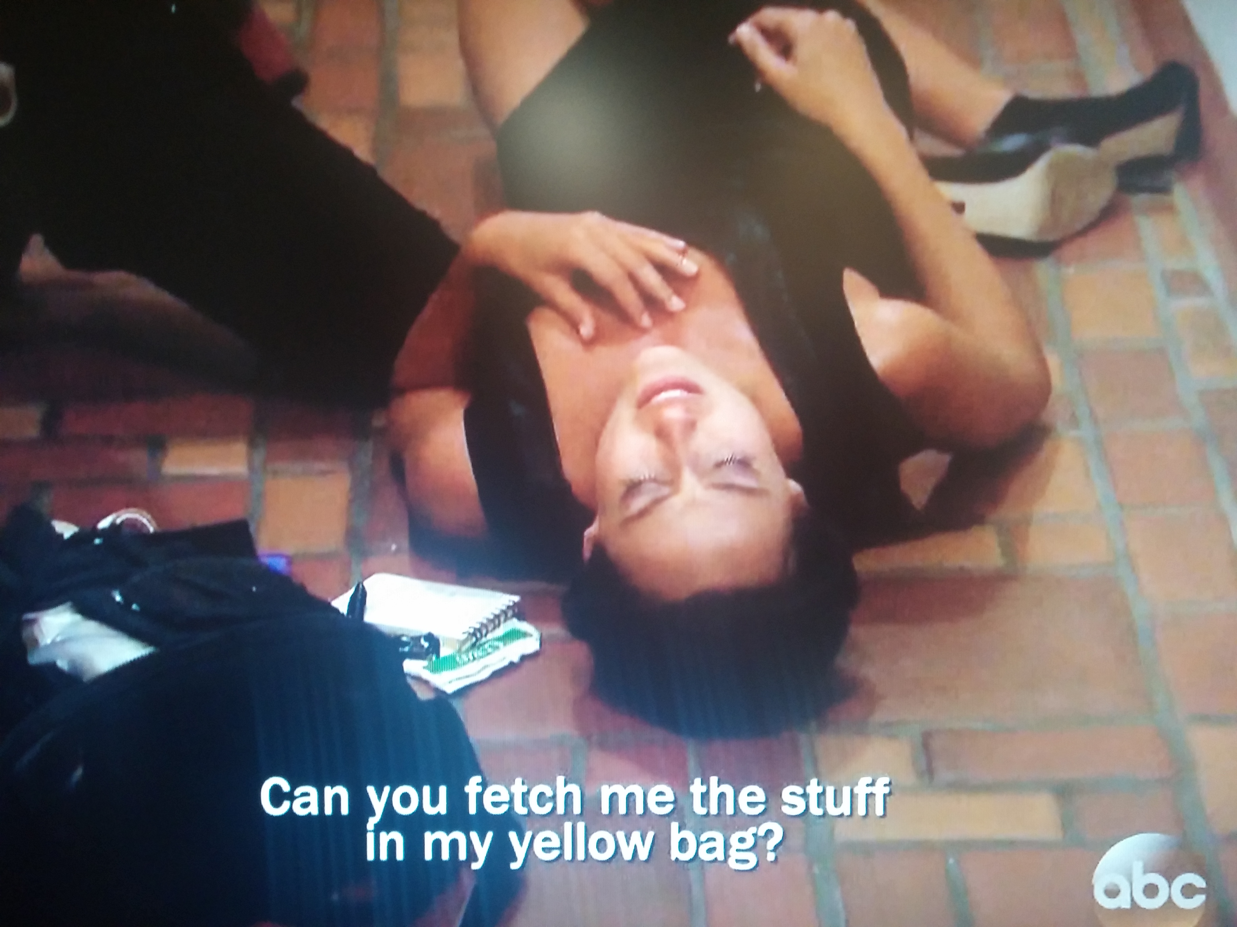 What exactly is in the yellow bag? Cue cards? Head shots? Her agent’s phone number? And this woman is a guidance counselor. I’d keep my kids away if I were you. Anyway, whatever is in the magic yellow bag, we have to wait until next week to find out, because we get the dreaded TO BE CONTINUED…..Next week, absolutely EVERYONE cries.