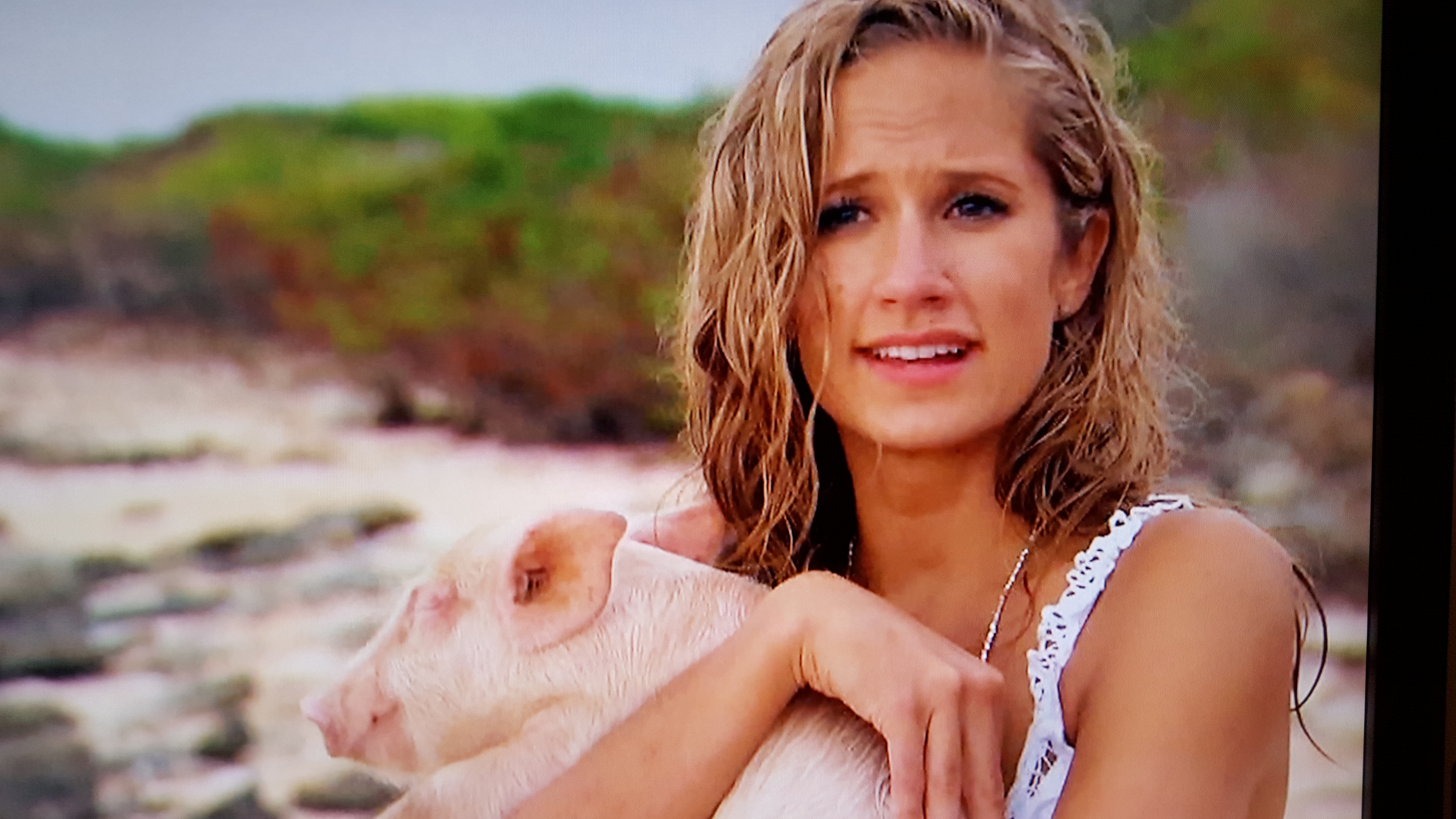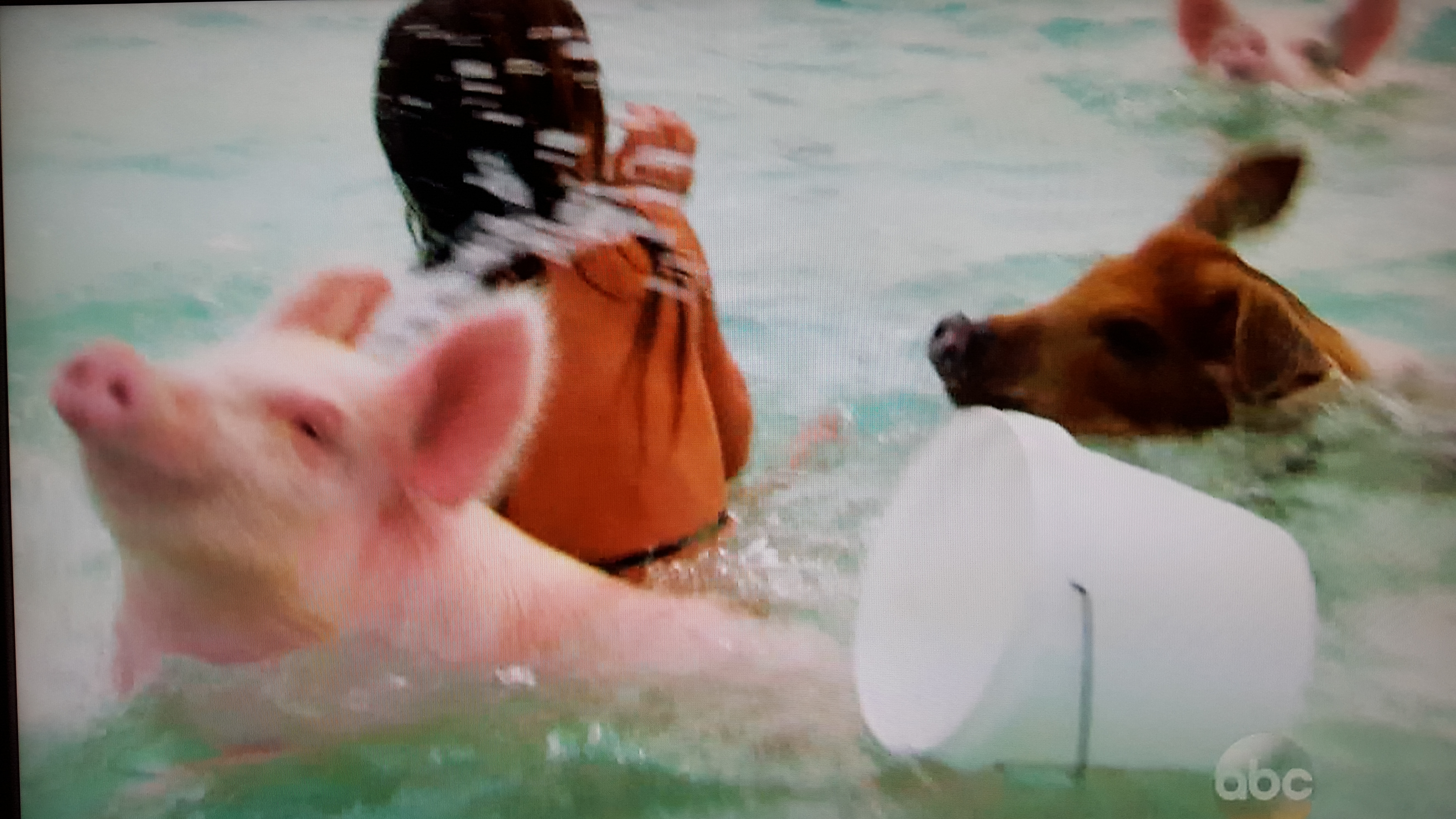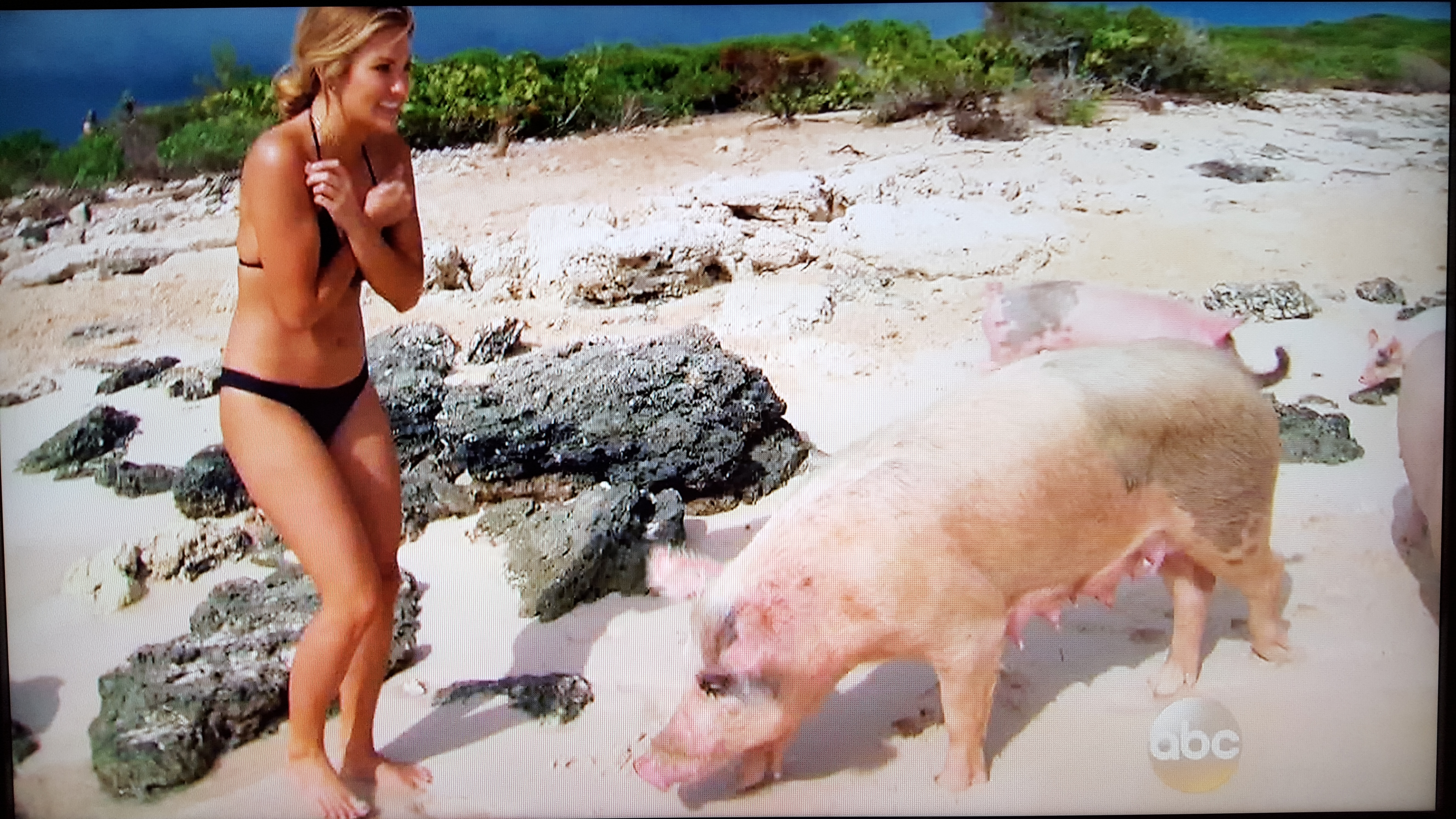 Nice to see Ben’s still hitting the sauce early and often. Who am I kidding – I’d pay hard money to switch places right now. So yeah, they go feed hot dogs to pigs. But Ben assures everyone they’re “chicken hot dogs”. Uh huh, right. This is the same production staff that doesn’t provide sunscreen on Bachelor in Paradise. I’m sure they went completely out of their way to fly pork-free hot dogs to the Exuma Cays, just so the pigs wouldn’t be offended. Anyways, it’s Pig-nado on the Bachelor: