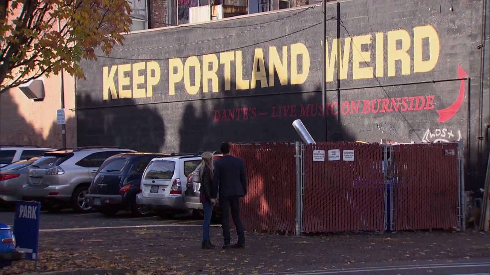 Super-tight skinny jeans, rolled up to the knee? That looks comfortable. Which, apparently, it isn’t, because the next scene…