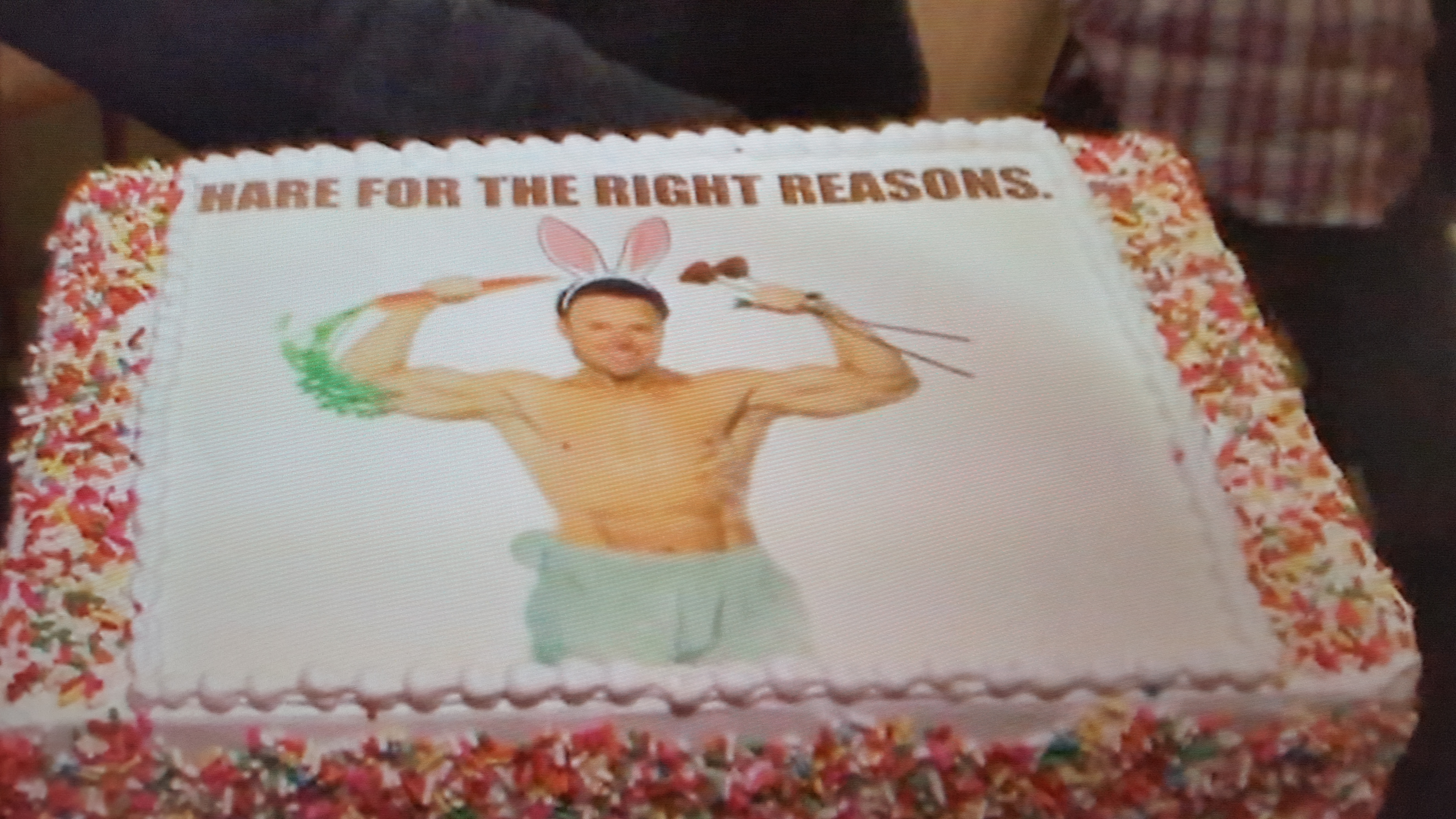 The Easter cake. Here’s my theory. Since it says “Hare for the right reasons”, I’m thinking maybe that viewing party likes to nickname and call Chris Harrison “Hare”. And so they made him into a bunny – or hare – with a carrot and ears. Maybe?
