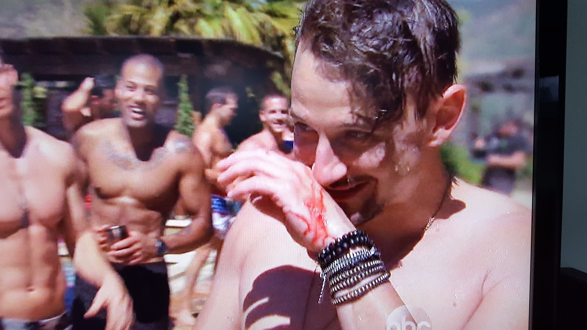 I think this is going to be a slaughter, and when Evan gets another nosebleed (from touch football, btw), it looks like I’m going to be right. But, by some miracle, Team Rudy pulls out a win and Team Goliath gets sent home. But, you may ask, what’s happening back out the hotel while this Clash of Titans is taking place? Nothing much; just Luke hanging out on the couch with Alex and Chad.