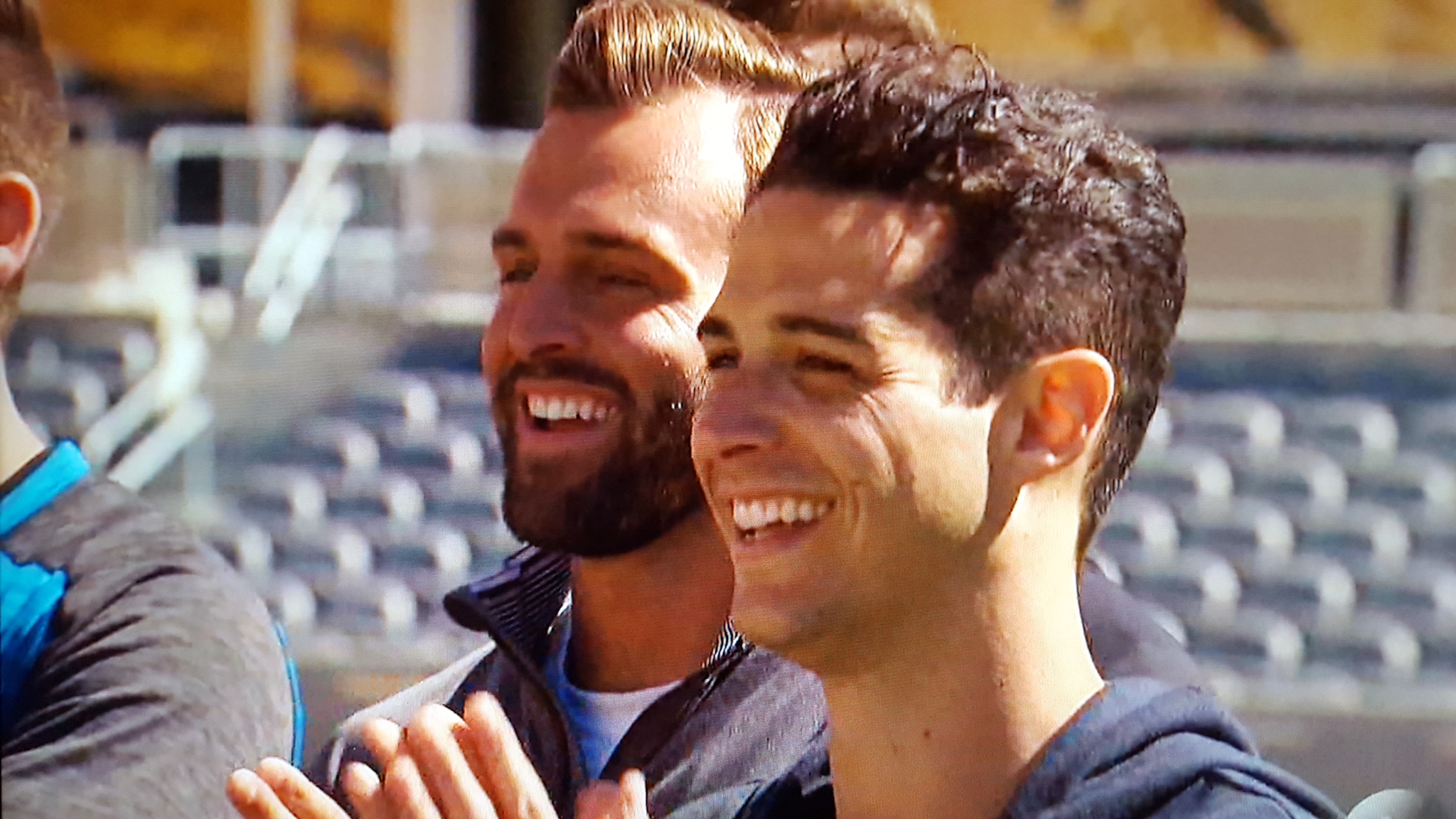The Players: Derek, James T, Daniel, Chase, Wells, Vinny, James F, Evan, Grant, Jordan, and Robby. Which leaves Alex and Chad left for the 2-on-1 date, setting up an epic battle of Good vs Evil. Which we know, because we hear “Good vs Evil” approximately 300 times for the rest of the episode. The Game: Football shenanigans with Ben Roethlisberger, Hines Ward, and someone else from the Pittsburgh Steelers.